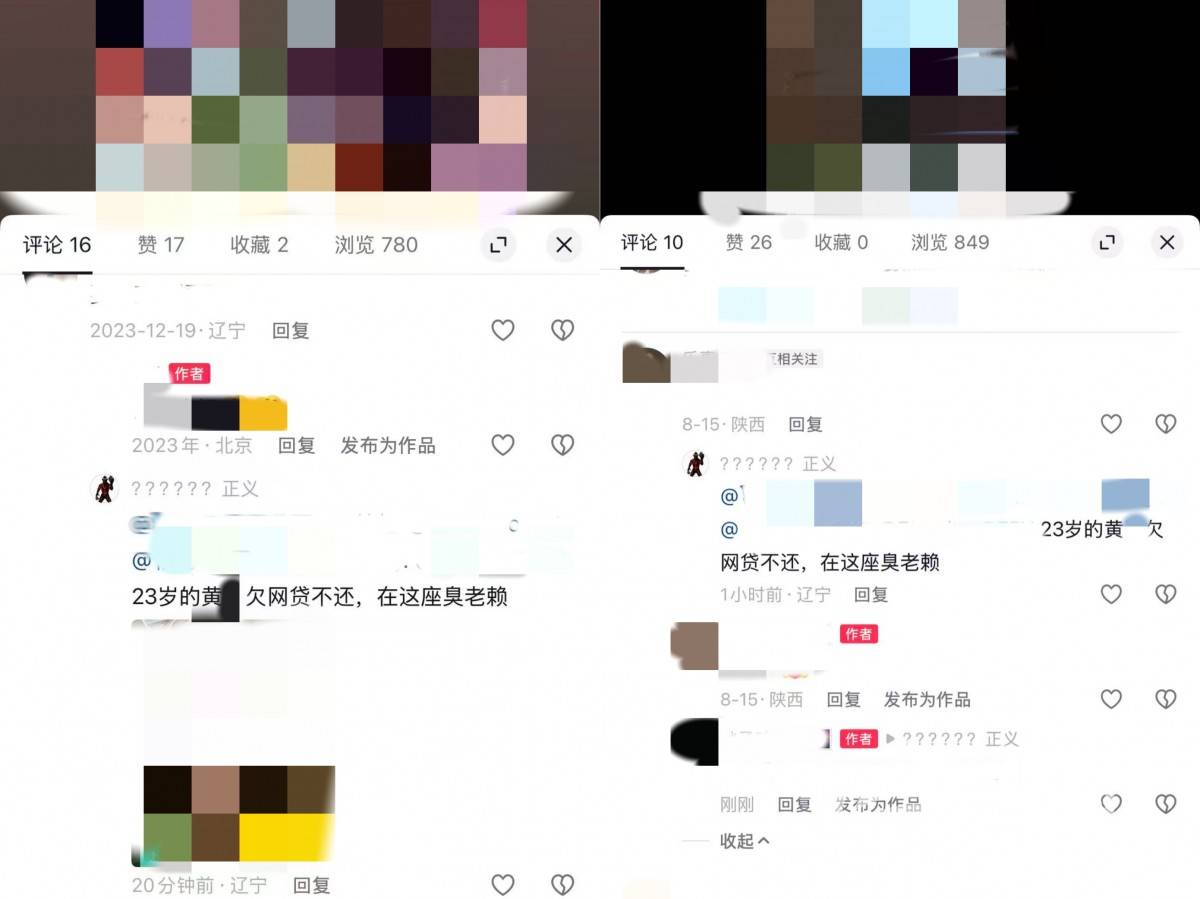 据王女士介绍,11月6日晚上,多年没联系的小学同学发信息问她“最近是不是发生了什么事?”突如其来的关心让王女士摸不着头脑,她赶紧问同学是怎么回事?同学给她发来了一张截图,只见同学抖音作品评论区的下方,出现了一条用户名为“正义”、IP所在地为辽宁的用户发表的评论:“23岁的黄*欠网贷不还,在这座(做)臭老赖”,同时@了王女士和她的好友。王女士随即打开自己的抖音账号,发现同一个用户也在她发布的自拍照片下留言:“这个就是黄*的老赖女朋友”,并@了她的好友。